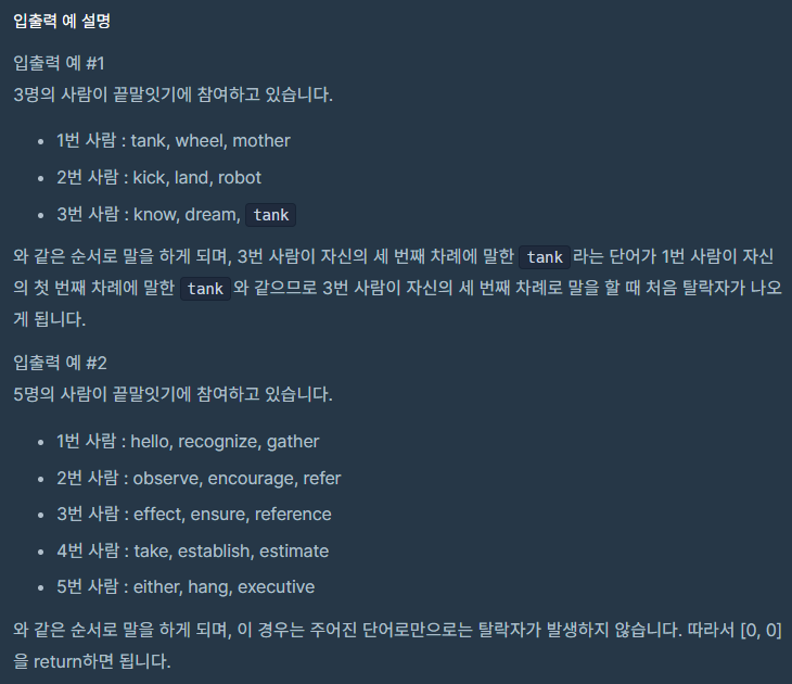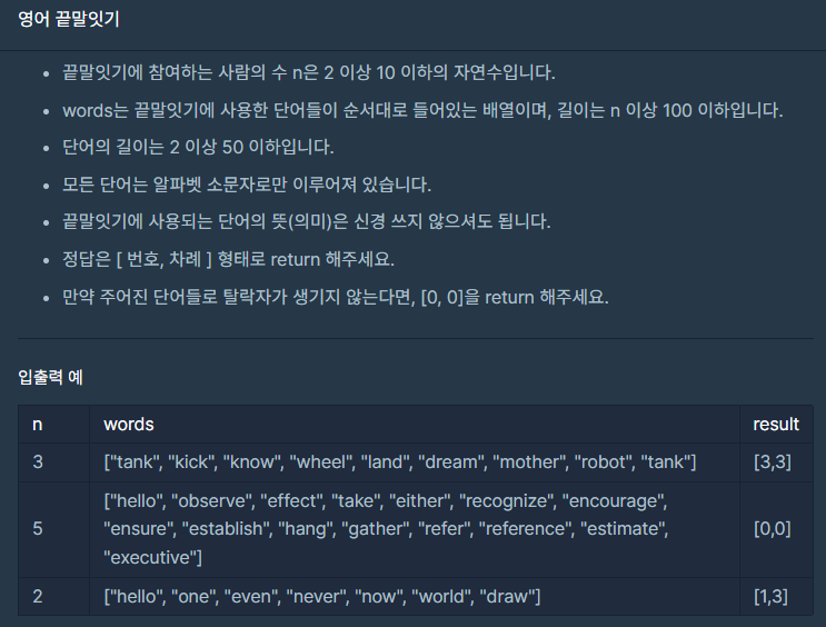 words[i-1][-1]과 words[i][0]비교하여 같지 않거나, words[i]가 words[:i]의 배열 안에 없을 경우, (i의 바로 직전까지의 배열안에 없을 경우)
