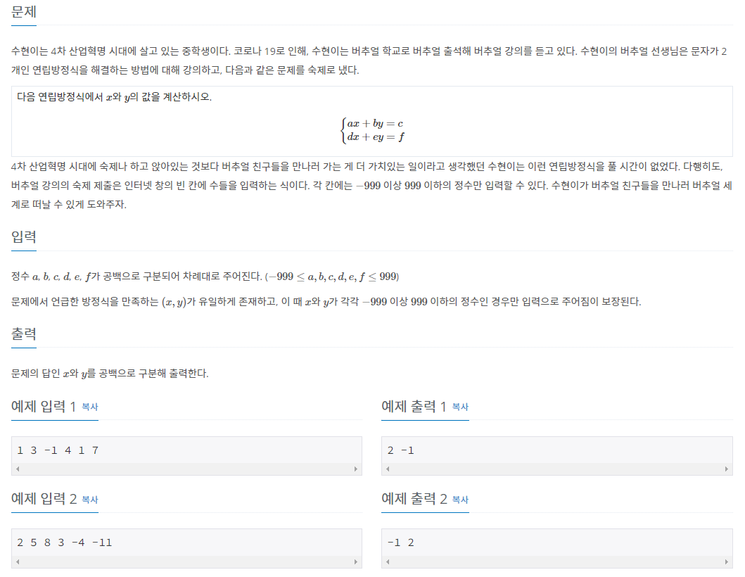 브루트포스와 가까운 건 내 풀이인 것 같긴 한데 이 공식을 알면 다음에 연립방정식 문제가 나왔을 때 효율적으로 풀 수 있을 것 같다.