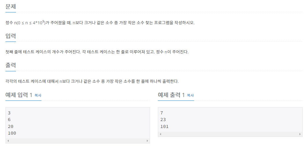 정수 n(0 ≤ n ≤ 4*109)가 주어졌을 때, n보다 크거나 같은 소수 중 가장 작은 소수 찾는 프로그램을 작성하시오.