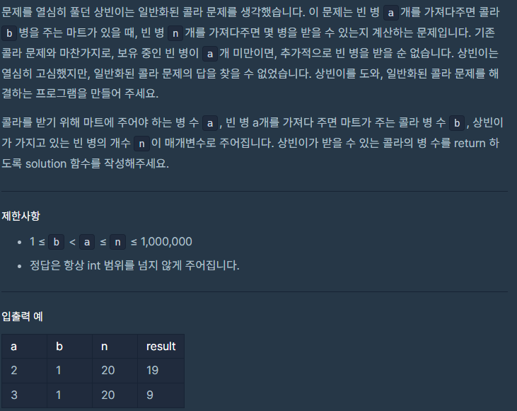 n이 a로 나누어 떨어지지 않으면 ((n // a) * b)에 n%a를 더해주었다.