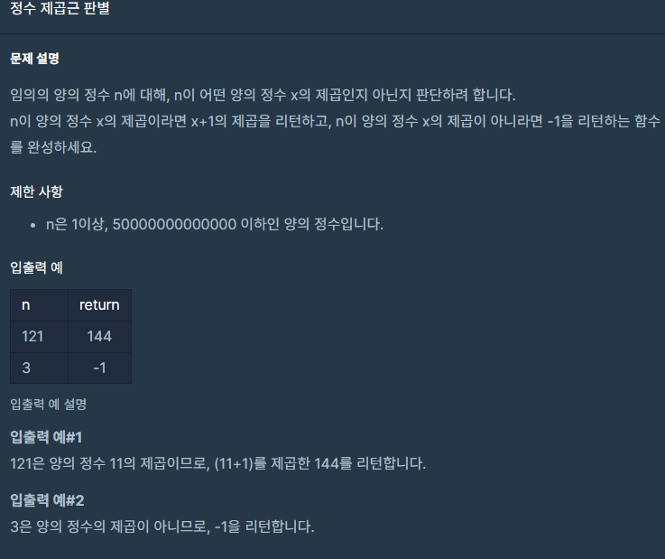 n을 제곱근으로 바꾸고 n-parseInt(n)이 0이 아니라면 n의 제곱근은 정수가 아님
