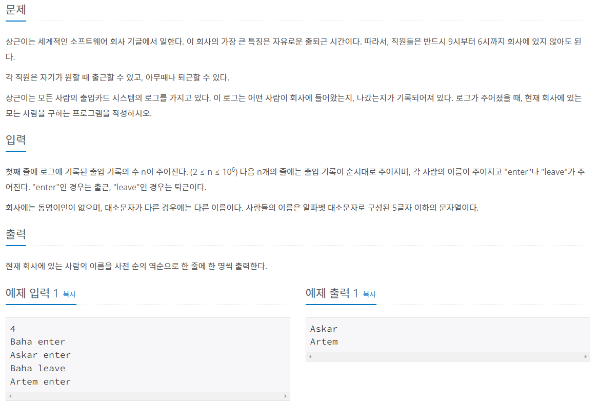 처음에는 set을 이용하여 enter와 leave목록을 만들어서 서로 빼주려고 했는데 시간초과가 났다.