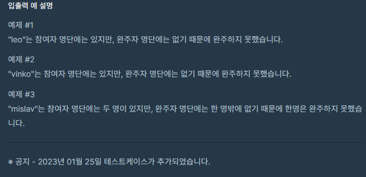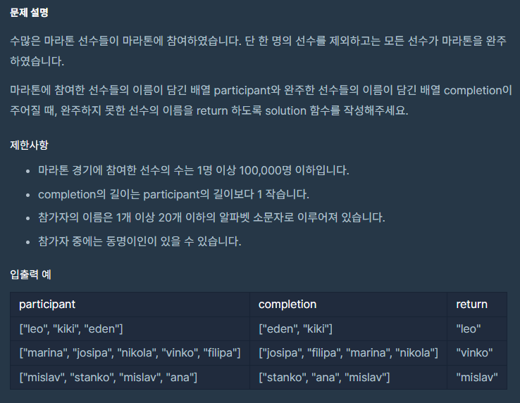 answer = [i for i,j in d.items() if j > 0] items()는 딕셔너리의 key와 value값들을 반환한다. 따라서 만약 j(value)가 0보다 크면 완주하지 못한 선수이므로 이 값만 리스트에 반환한다.