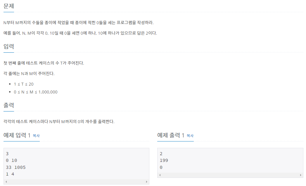 N부터 M까지의 수들을 종이에 적었을 때 종이에 적힌 0들을 세는 프로그램을 작성하라. 예를 들어, N, M이 각각 0, 10일 때 0을 세면 0에 하나, 10에 하나가 있으므로 답은 2이다.