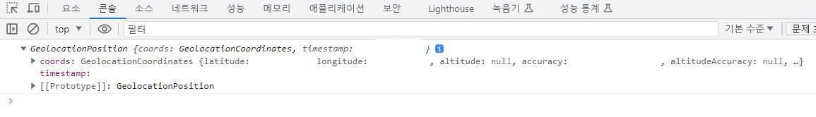 그런 다음 페이지로 와서 위치 허용을 누르면 콘솔에 다음과 같은 텍스트가 출력된다.