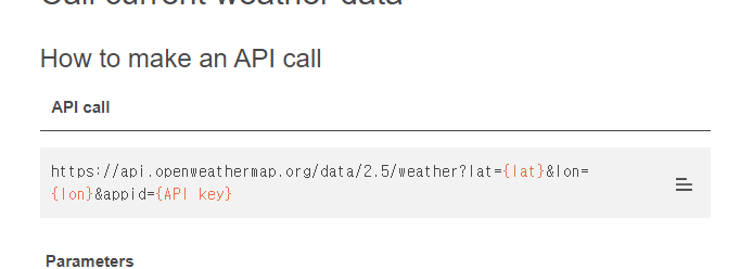 페이지를 들어가면 이런 링크가 있는데, 이것을 복사한 후 {lat} {lon} {API key}의 부분에 아까 우리가 구했던 값과 홈페이지의 내 프로필에 있는 API key를 복사해서 넣어준 후에 링크에 들어가면 날씨 정보가 나온다. (괄호까지 없애야 함)