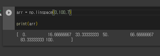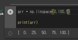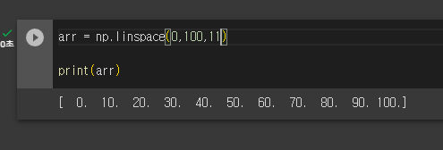 위 코드를 해석해보면, 11개의 0부터 100까지의 숫자를 출력하라는 것인데, 숫자들이 균일한 간격의 차이를 갖고 있다.