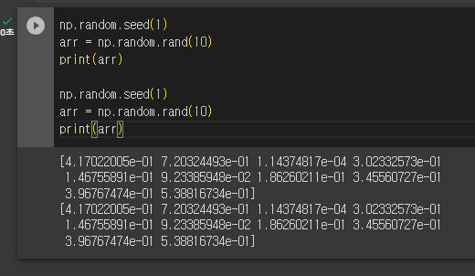원래 랜덤값을 출력하면 출력할 때마다 값이 모두 랜덤으로 바뀌는데, seed를 통하여 다음과 같이 동일한 난수를 출력시킬수 있다.