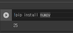 먼저 넘파이 설치를 해야 하는데 !pip install numpy를 입력하고 실행하면 된다. 코랩은 이미 설치되어 있기 때문에 별도로 설치를 하지 않아도 된다.