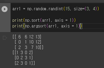 예를 들어서 argsort 결과의 1행값을 보면 1 3 0 2인 것을 볼 수 있다.