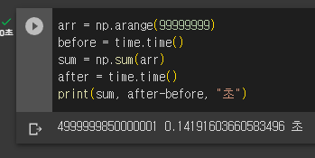 그리고 for문을 이용했을 때와 np.sum 모듈을 사용했을 때의 연산 속도 차이를 알아본다.