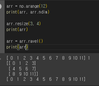 resize() 는 reshape()와 비슷하지만 원본 배열을 변경시킨다는 차이점이 있다.