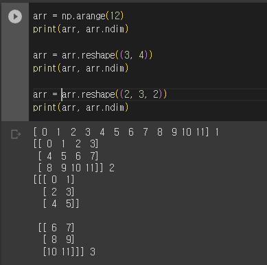 1차원 배열을 reshape()함수를 통해 2차원 배열, 3차원배열로 변경하였다.