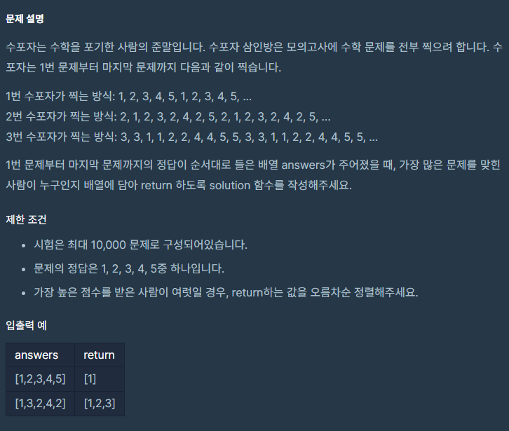1번부터 3번 수포자들이 답을 찍는 일정한 패턴을 배열로 저장해 준 다음, i 번째의 답과 패턴의 i 번째(즉 i를 패턴의 길이로 나누었을 때의 나머지 번째)가 같으면 += 1을 해주었다.