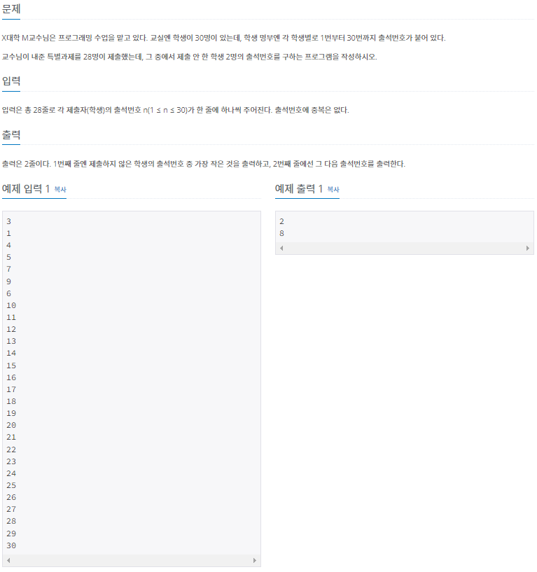 X대학 M교수님은 프로그래밍 수업을 맡고 있다. 교실엔 학생이 30명이 있는데, 학생 명부엔 각 학생별로 1번부터 30번까지 출석번호가 붙어 있다. 교수님이 내준 특별과제를 28명이 제출했는데,