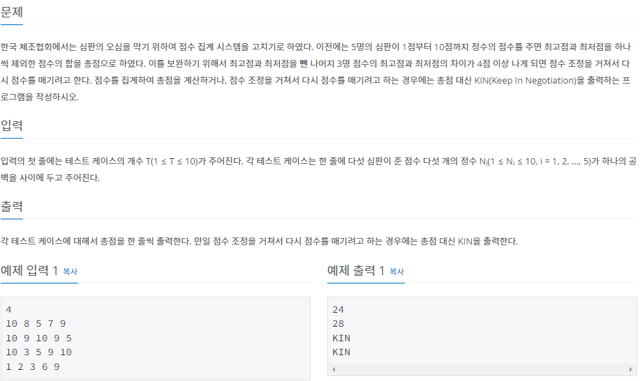 입력의 첫 줄에는 테스트 케이스의 개수 T(1 ≤ T ≤ 10)가 주어진다. 각 테스트 케이스는 한 줄에 다섯 심판이 준 점수 다섯 개의 정수 Ni(1 ≤ Ni ≤ 10, i = 1, 2, ..., 5)가 하나의 공백을 사이에 두고