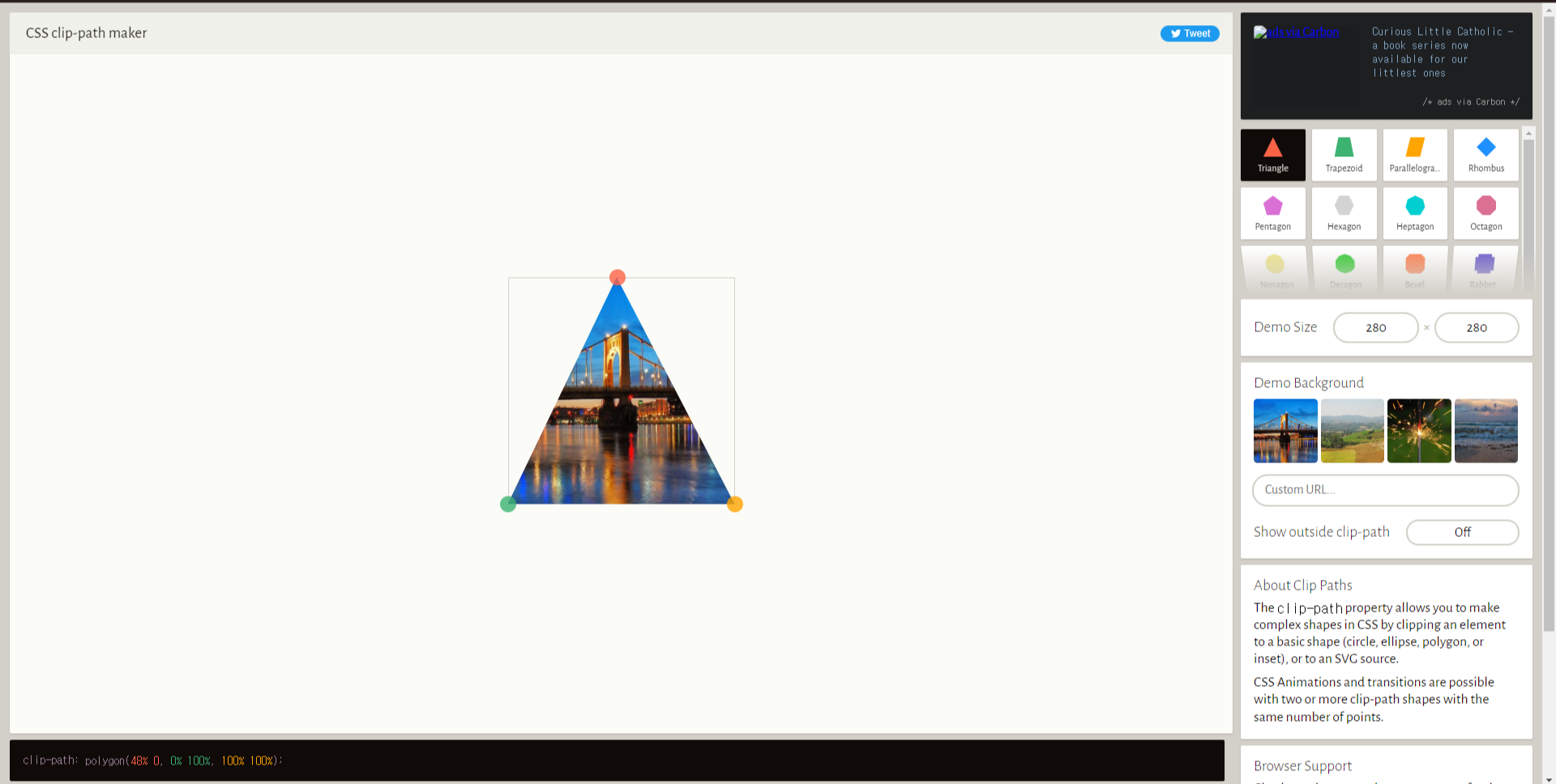 About Clip Paths The clip-path property allows you to make complex shapes in CSS by clipping an element to a basic shape (circle, ellipse, polygon, or inset), or to an SVG source. CSS Animations and transitions are possible with two or more clip-path shape