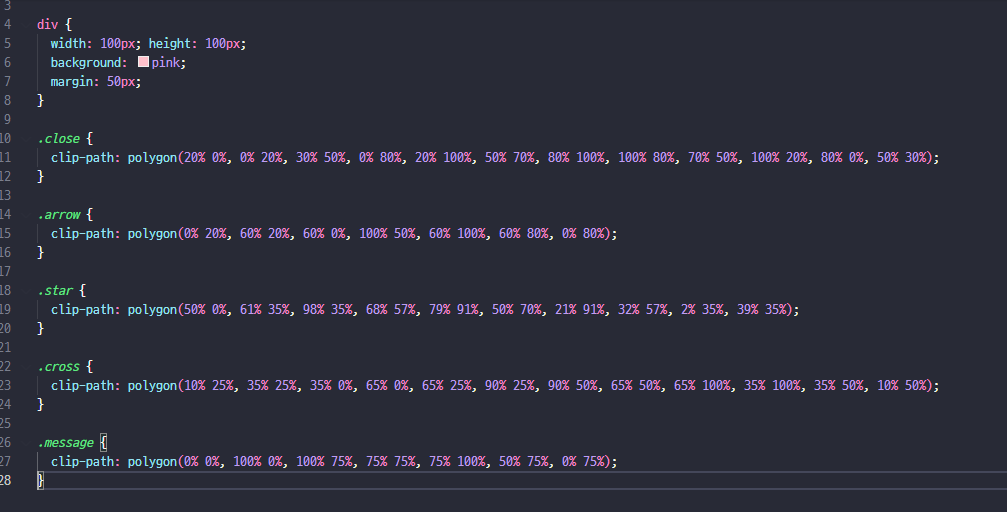 이와 같은 화면이 나온다. 오른쪽의 다양한 도형이 있고, 하단의 코드가 바로 화면에 나오는 도형을 만들어주는 clip-path코드이다.