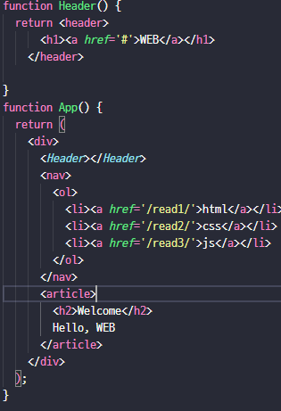 여기의 header를 리액트를 이용하여 사용자정의 태그 <Header>로 만들 것이다.