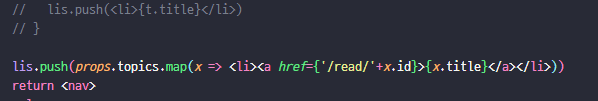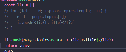 빈배열 lis에다가 <li>{t.title}</li>의 형태로 push 해 주면, topics[i]의 title값이 대입되면서