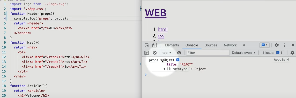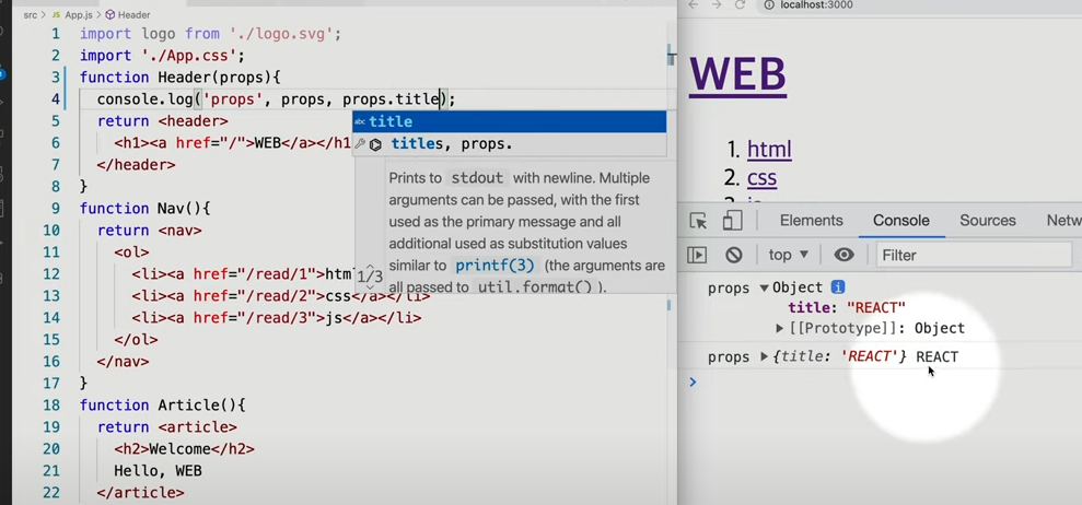 props.title을 입력하면 오른쪽과 같이 REACT가 출력되는 것을 볼 수 있다.