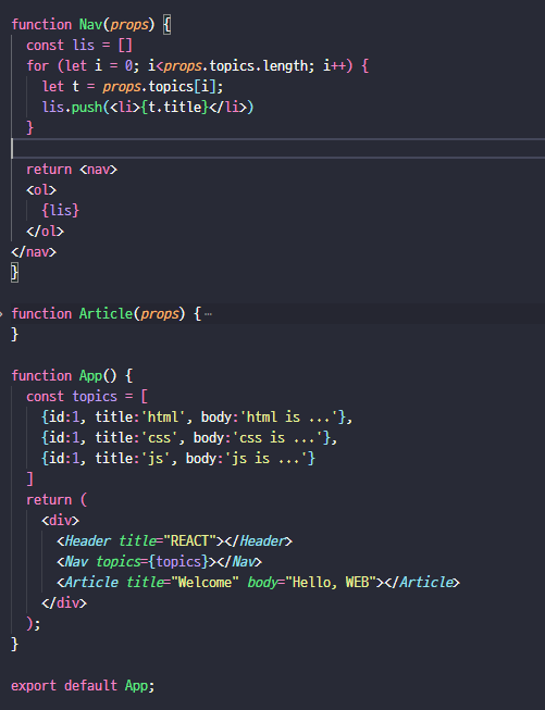 for 문을 이용하여 topics의 길이만큼 반복되게 할 것이고, let t라는 변수를 만들어 여기에 props.topics[i] 값을 대입해 준다. (topics 배열이 차례대로 대입됨)