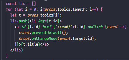 먼저 아까처럼 a태그 안에다 onClick이벤트를 작성하고, event => {} 함수를 만들어 준다.