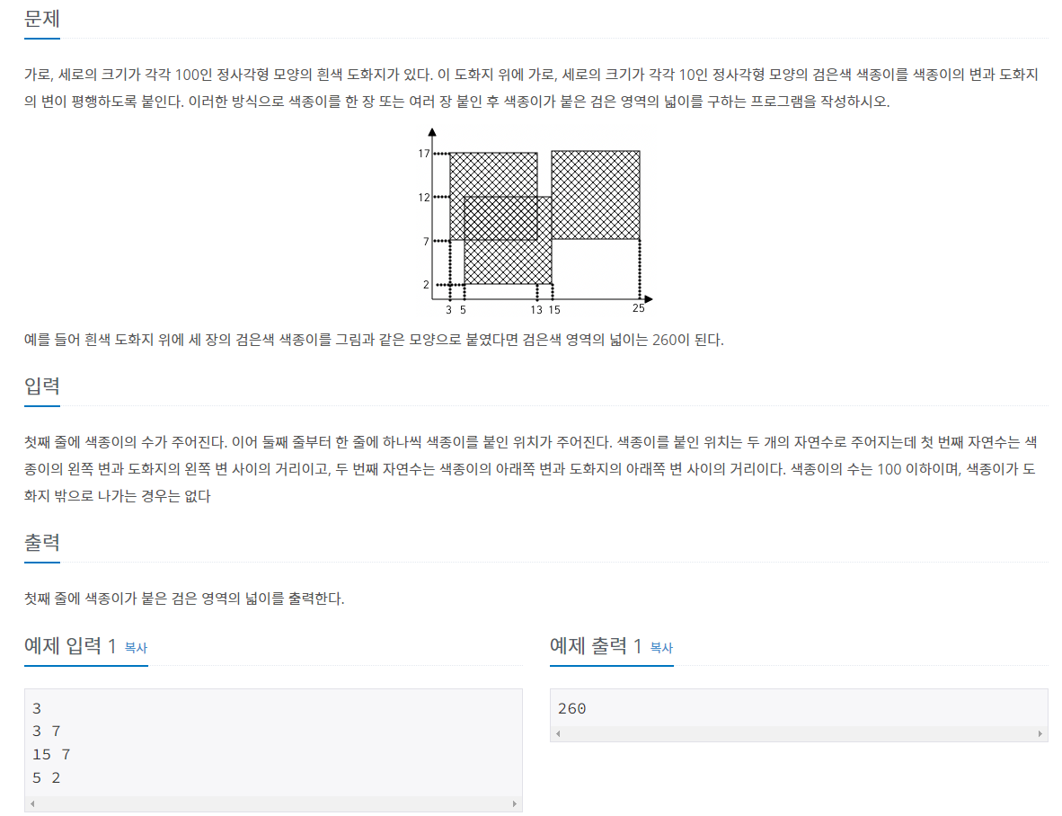 거기서 차지하는 영역의 인덱스만 1로 바꿔준 다음에 배열안의 값을 다 더하면 끝나는 간단한 문제였다..
