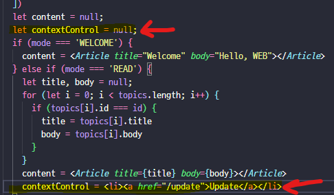 contextControl = <li><a href="/update">Update</a></li>를 넣어 준다. (방금 잘라냈던 코드 붙여넣기)